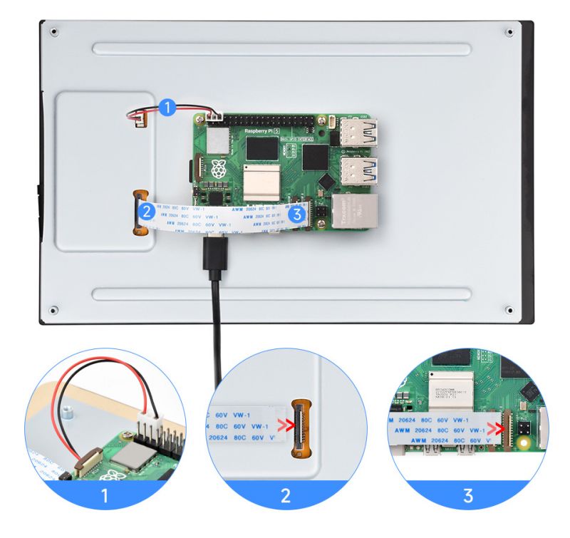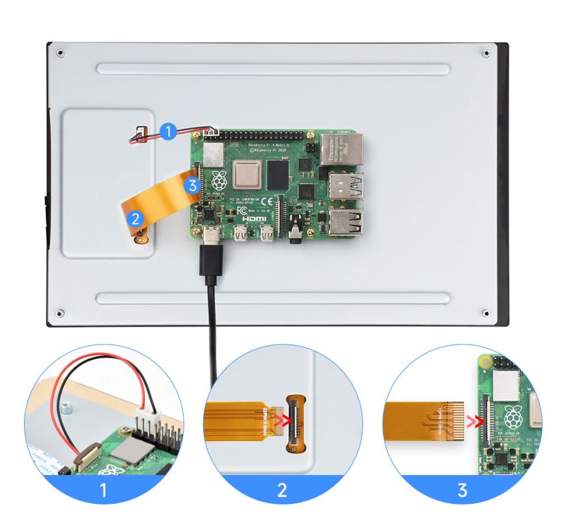 - Use the "FFC Cable 22PIN 200mm (opposite direction)" to connect the DSI port of the display to the 22PIN DSI port of the Raspberry Pi motherboard.