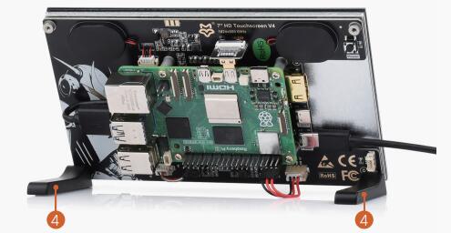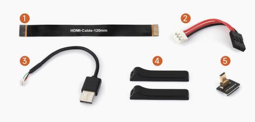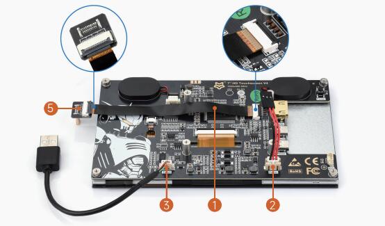 Connect cables ①, ② and ③ to their corresponding positions as shown in the image below. Connect cable ① to the LCD adapter ⑤ and connect it to the Raspberry Pi's micro HDMI port.