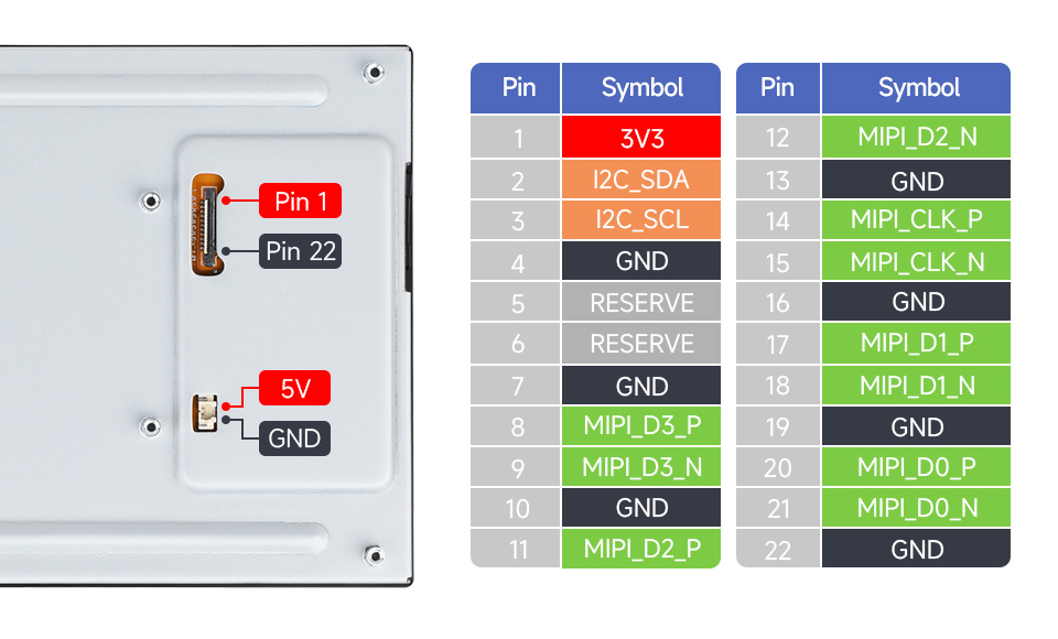 - Use the "FFC cable 22PIN 200mm (different direction)" cable to connect the DSI port of the display to the 22PIN DSI port of the Raspberry Pi motherboard.