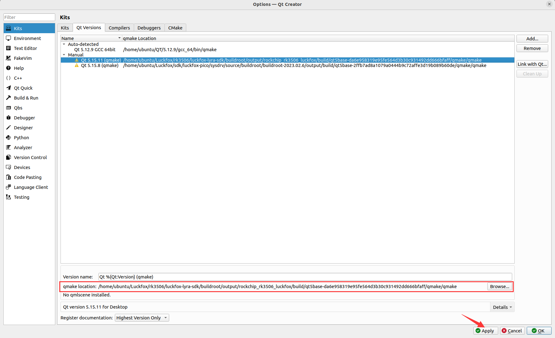 sudo ln -s /SDK目录/buildroot/output/rockchip_rk3506_luckfox/build/qt5base-da6e958319e95fe564d3b30c931492dd666bfaff/qmake/qmake /usr/bin/qmakeUpdate environment variables: