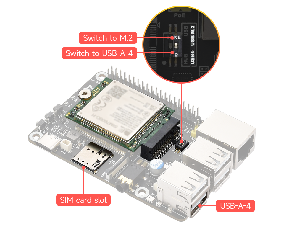 - 4G Internet Access: Further toggle the switch to the KE position to activate the USB M2 interface for 4G module compatibility.