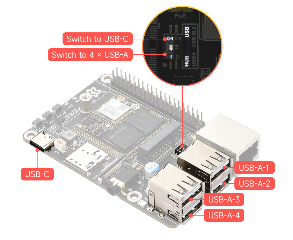 | Set to 1 | USB Host Mode | Power supply only, no communication | 4 USB ports active; fourth USB A port shares with USB M2 |