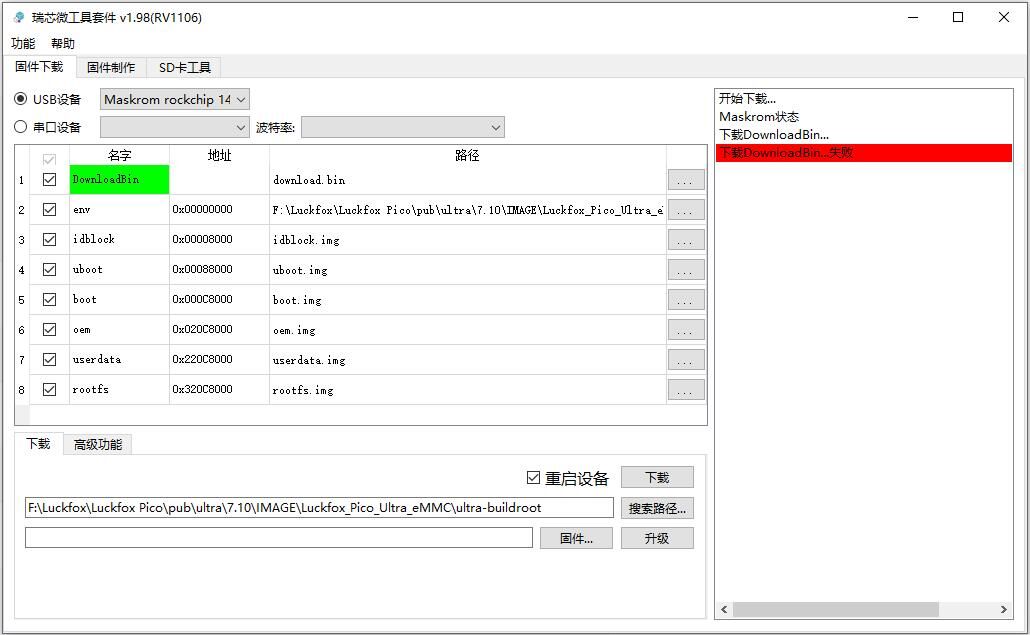 - SocToolKit recognizes the MASKROM device, but fails at DownloadBin...