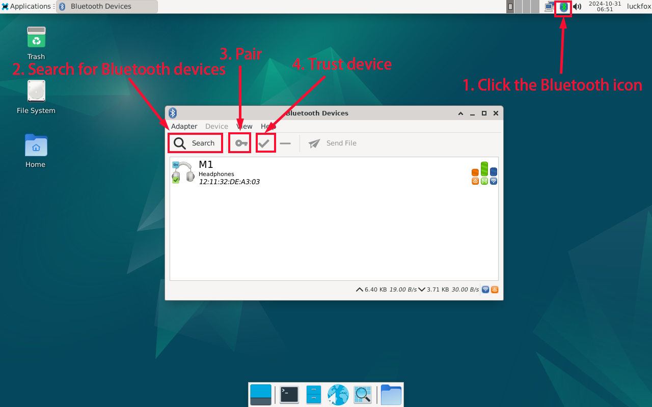 Right-click on the trusted device and select "Connect." The Bluetooth icon in the top-right corner will turn green, indicating a successful connection.