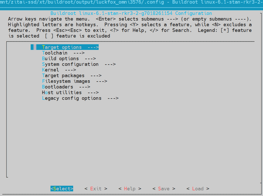 <Select>: Enter the submenu of the currently highlighted configuration item.<Exit>: Exit the current menu and return to the previous level.<Help>: Provide help information for the currently highlighted configuration item.<Save>: Save the current configuration changes without exiting the configuration tool.<Load>: Load a specified configuration file.