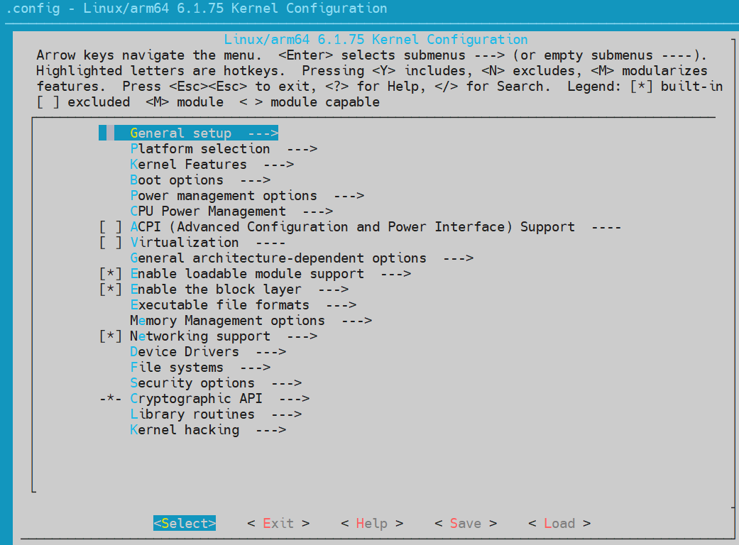 The middle section of the kernel configuration interface is a multi-level menu system. You can navigate using the up and down arrow keys, press Enter to enter submenus, and press Esc to return to the previous menu. Through this interface, users can flexibly configure the kernel according to system needs, selecting necessary features and drivers to build a customized kernel suitable for specific hardware and purposes. Below are the main items in the Linux kernel configuration interface: