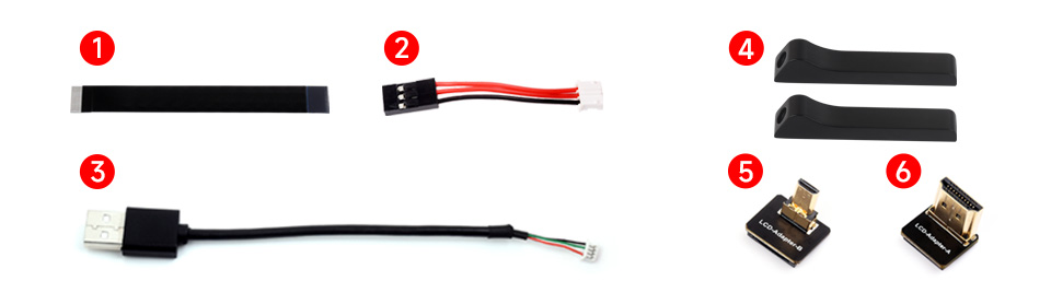 将①号线材接入到⑤号 LCD 转接头 (视树莓派主板型号选择⑤或⑥),连接到树莓派 micro HDMI 接口;