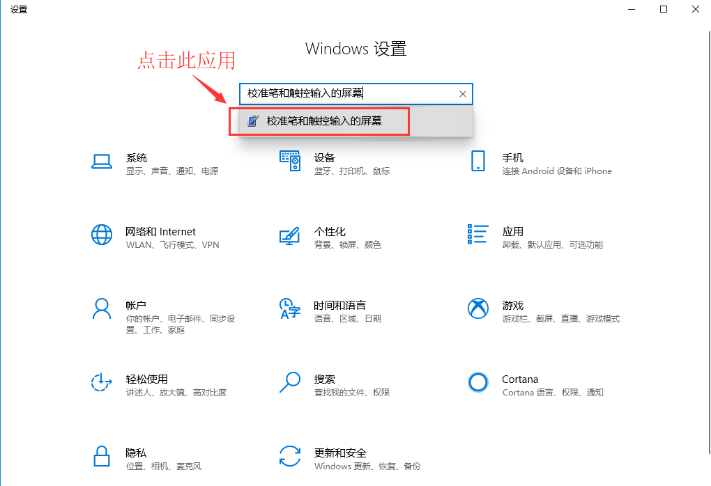 1.进入系统的Windows设置 ,在搜索栏输入并点击" 校准笔和触控输入的屏幕 " (如下图所示)