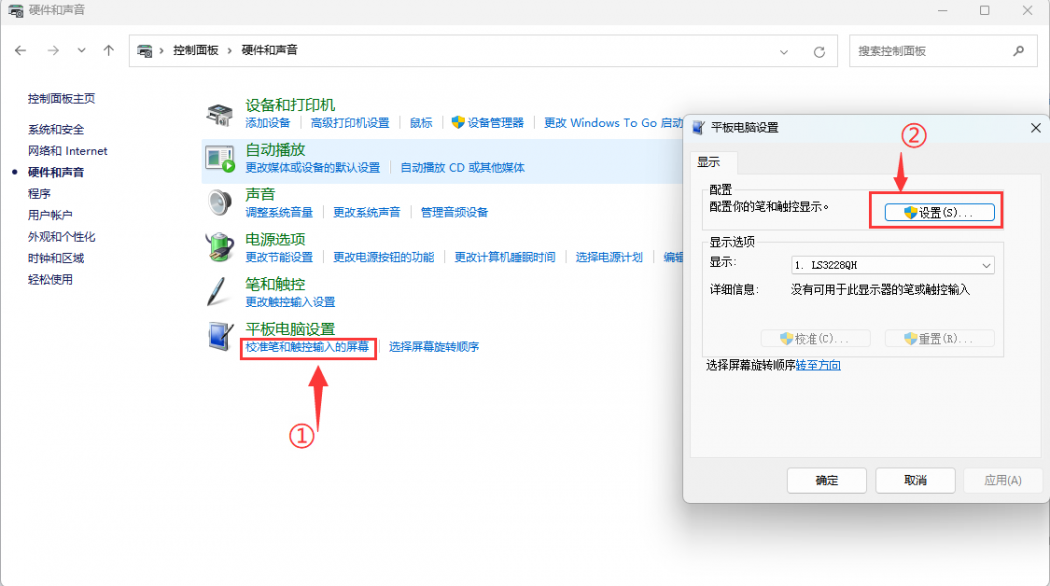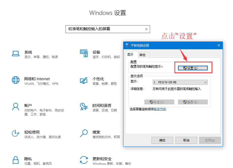 - 选择“校准笔和触控输入的屏幕 ”中,在弹出的平板电脑设置中点击“设置”