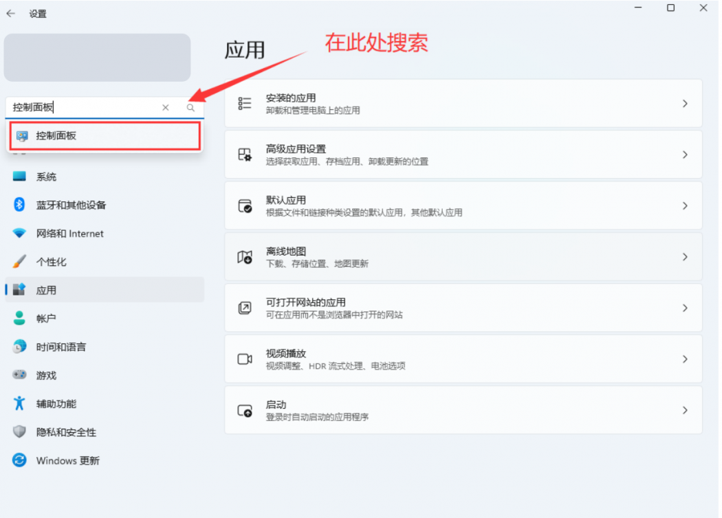 - 进入系统的Windows设置 ,在搜索栏输入并点击" 控制面板 " (如下图所示)