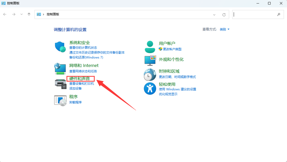 - 在弹出的“控制面板”界面中,选择“硬件与声音”
