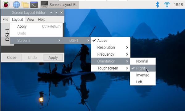 4.进入"Screen"->"DSI-1"->"Orientation" ,勾选您需要旋转的方向,最后点击"Apply"即可完成显示和触摸同步旋转。
