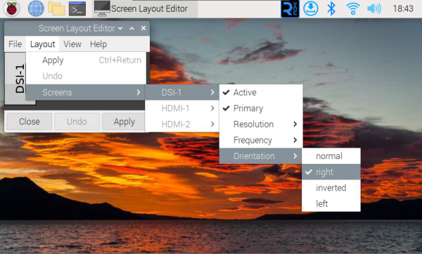 2.进入"Screen"->"DSI-1"->"Orientation" ,勾选您需要旋转的方向,最后点击"Apply",即可完成显示旋转。