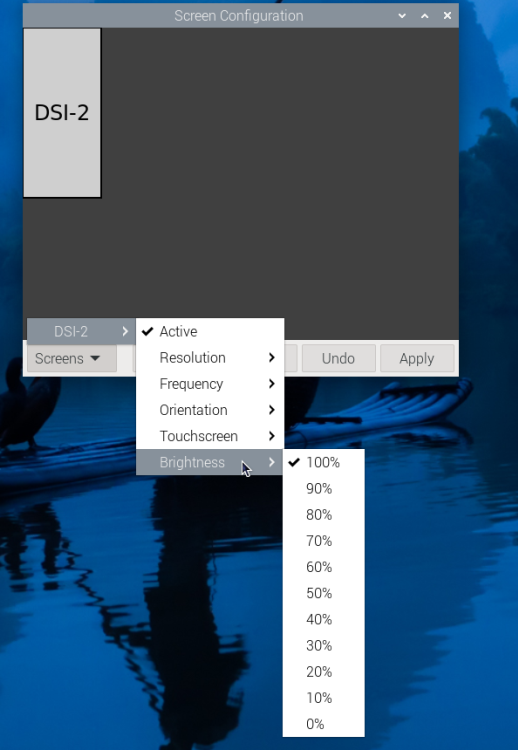 2.进入"Screen"->"DSI-2"->"Brightness" ,勾选您需要设置的背光亮度,最后点击"Apply",即可完成背光设置。