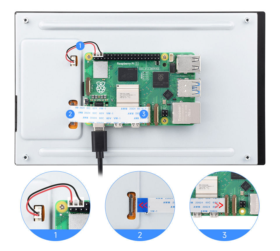 注意:请确保 DSI 排线方向连接无误,并通过 GPIO 引脚提供 5V 电源。