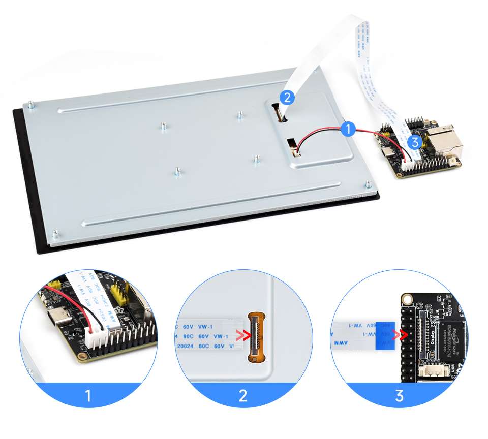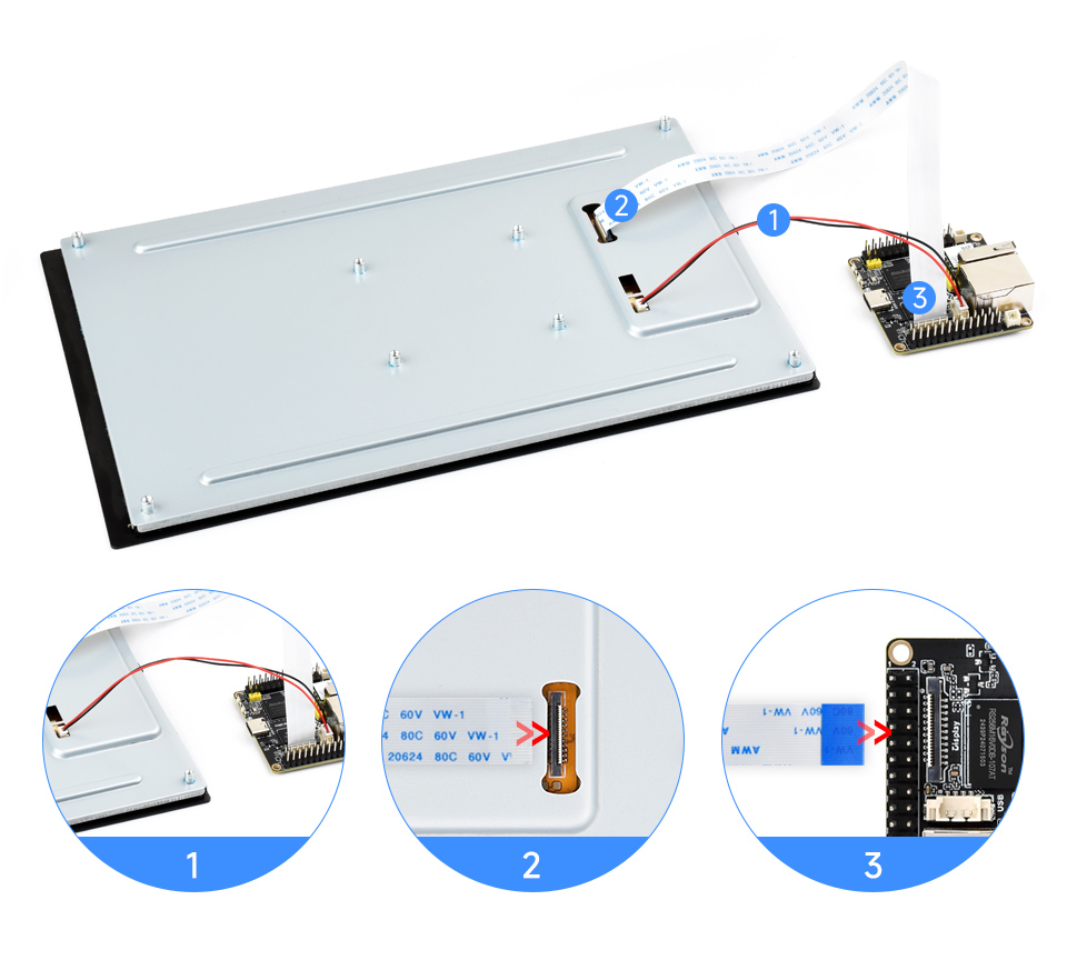 - 使用 22PIN 的 FPC 排线,将显示屏 DSI 接口连接到 Luckfox-Lyra 主板的 DSI 接口。(注意:排线的蓝色端朝向开发板芯片,)