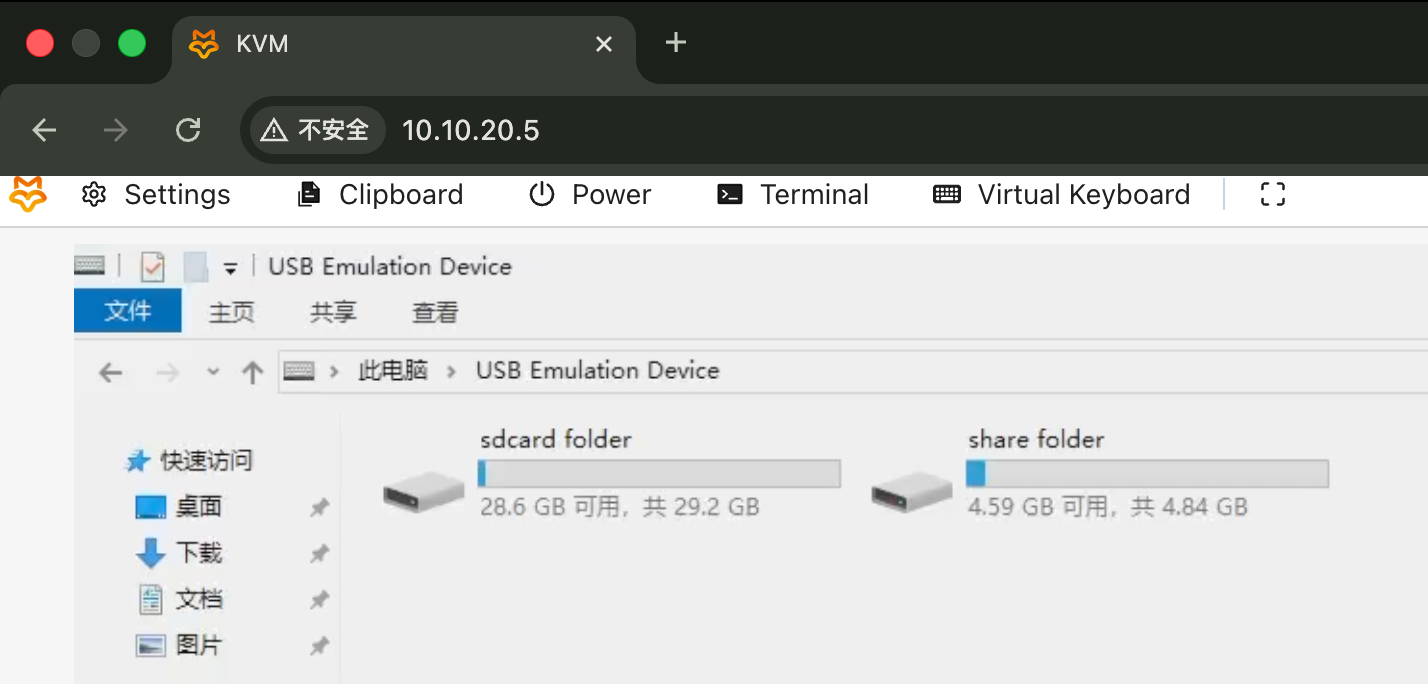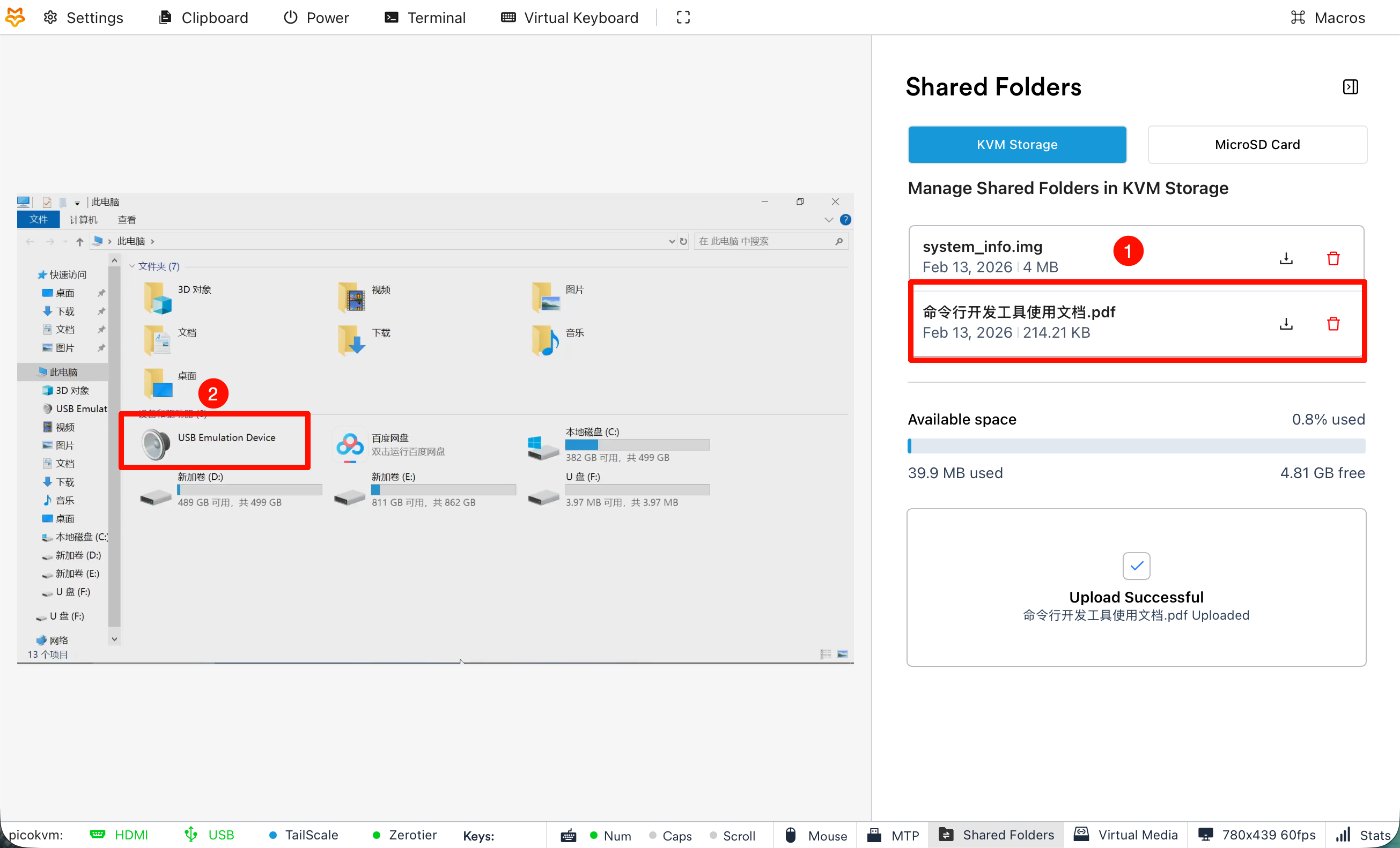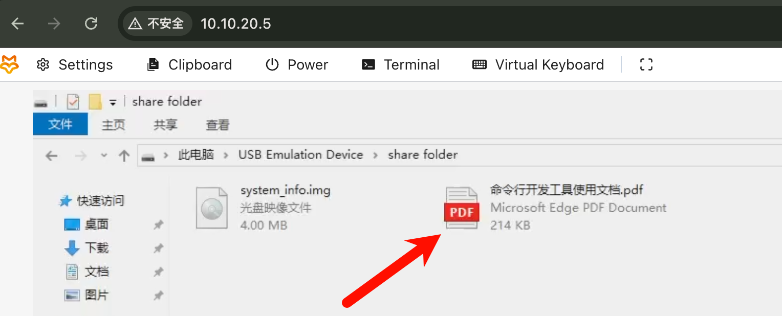 - 文件上传成功后,右侧状态栏会显示上传完成提示。此时,在被控主机中打开 This PC(我的电脑),找到 USB Emulation Device 并进入。