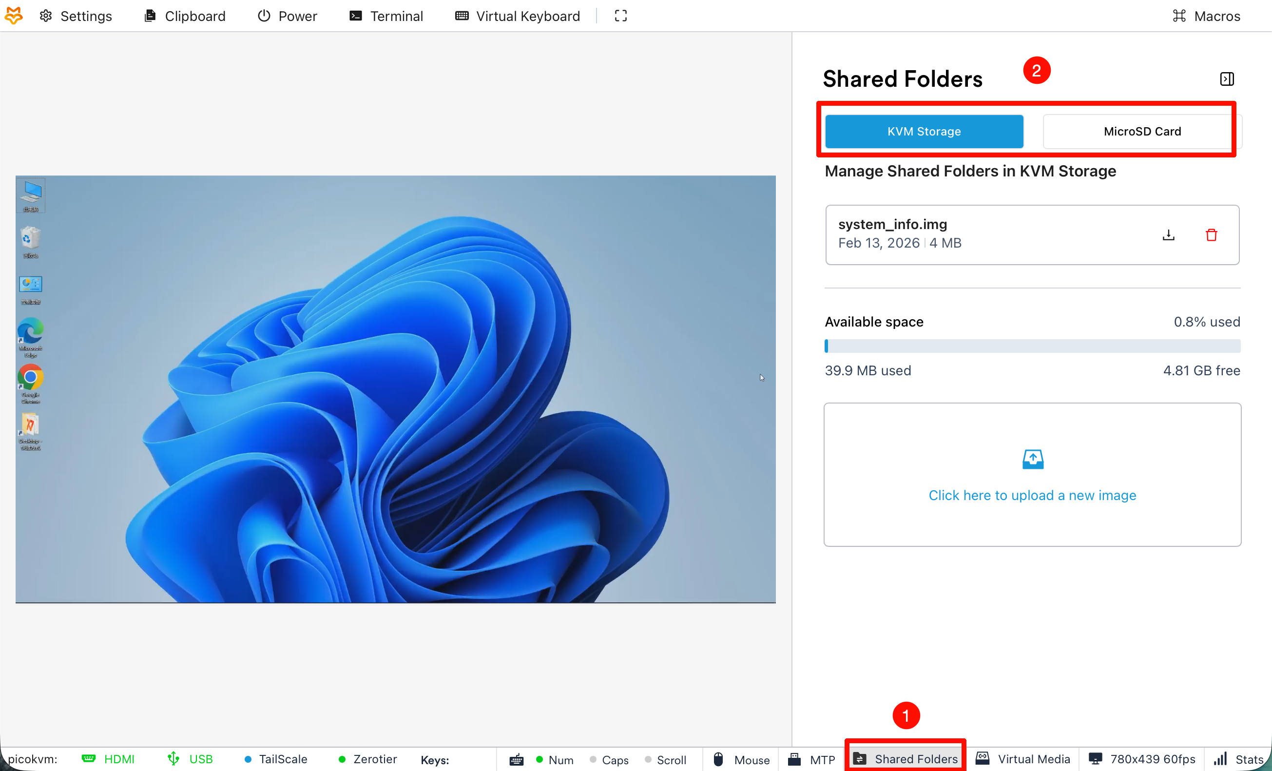 - 打开 KVM Web 管理界面,点击页面右下角的