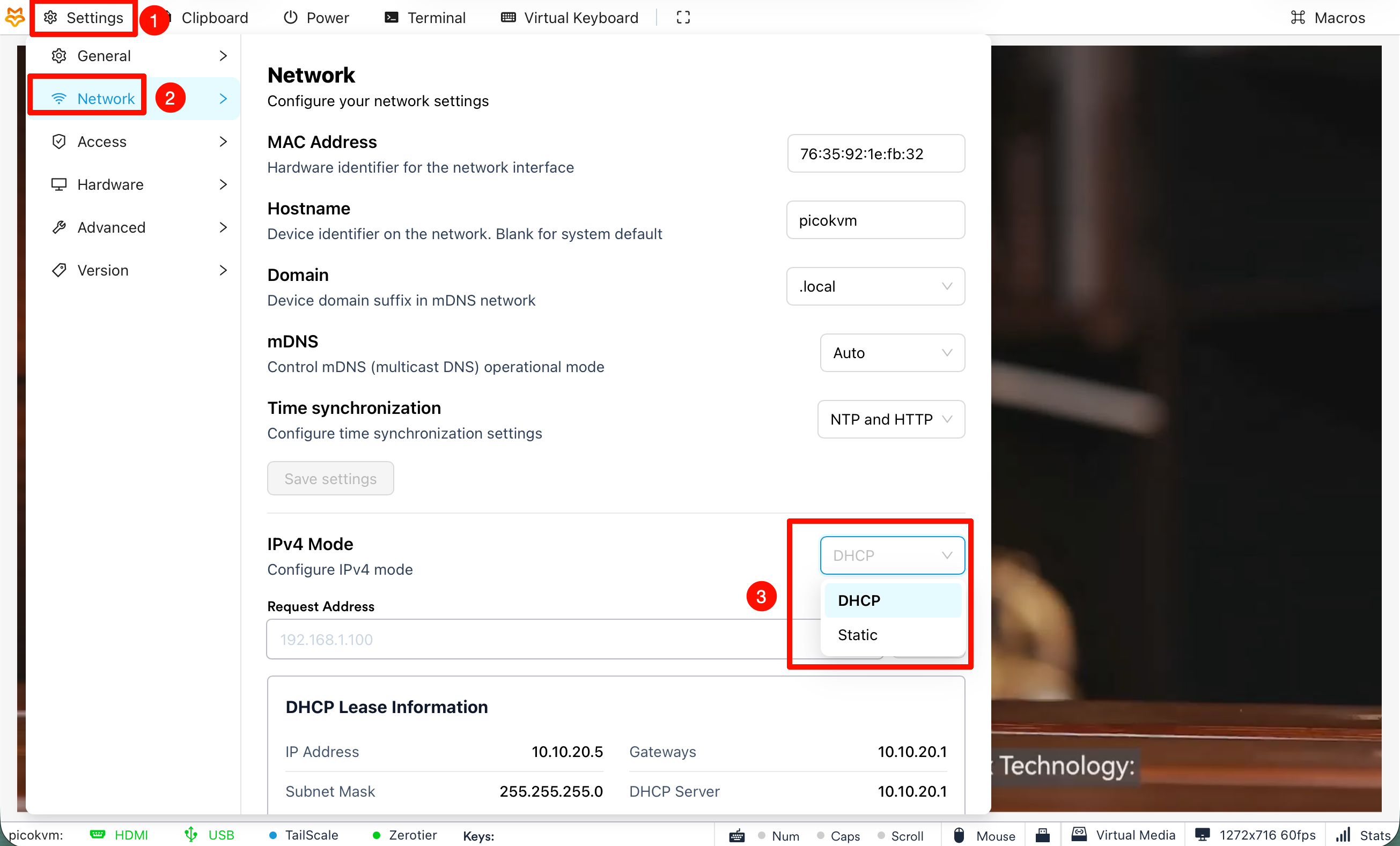 - 打开 PicoKVM 管理界面,进入 Settings → Network。