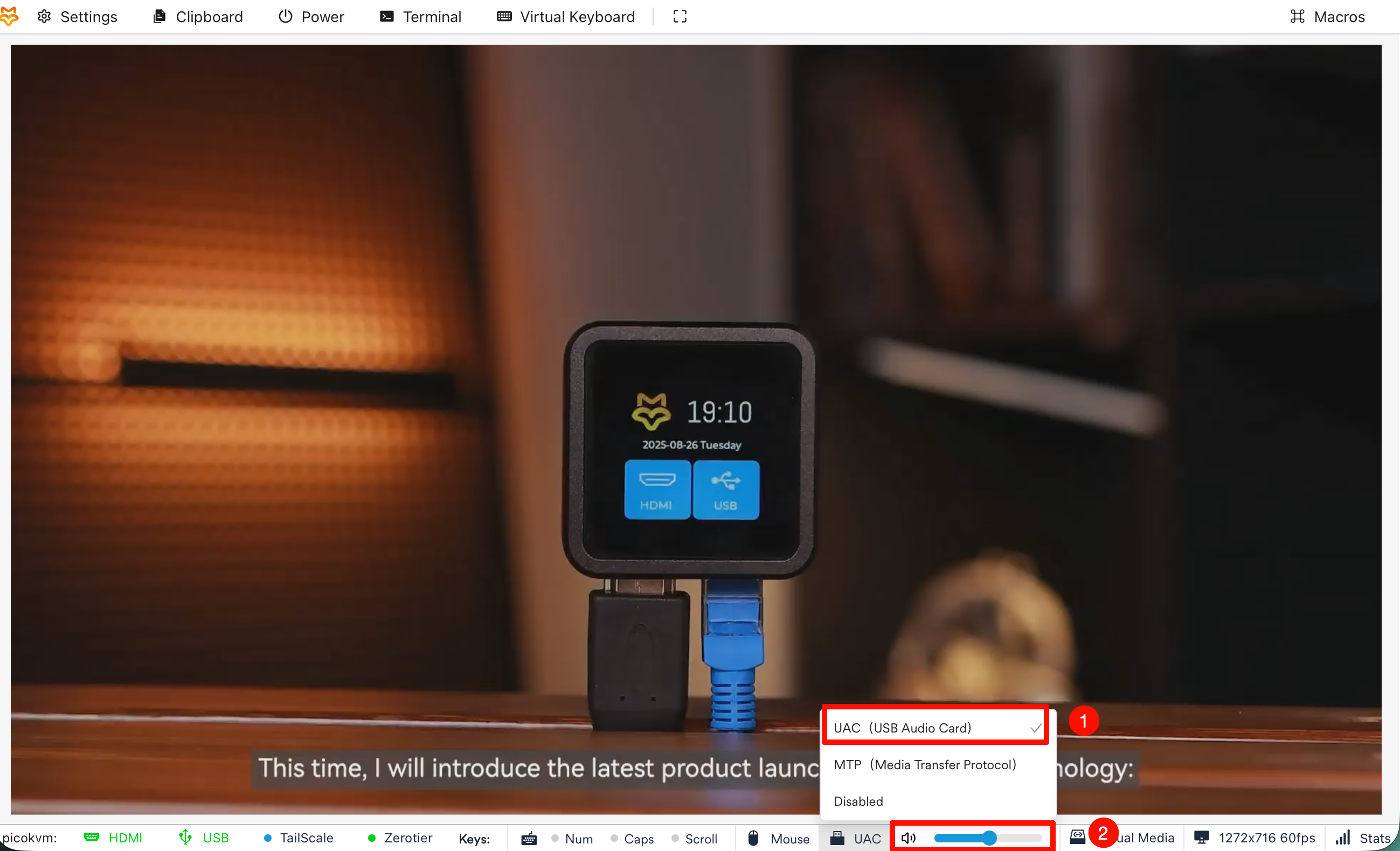 启用后,被控主机的音频将通过 USB 声卡方式传输到当前使用的主机。
