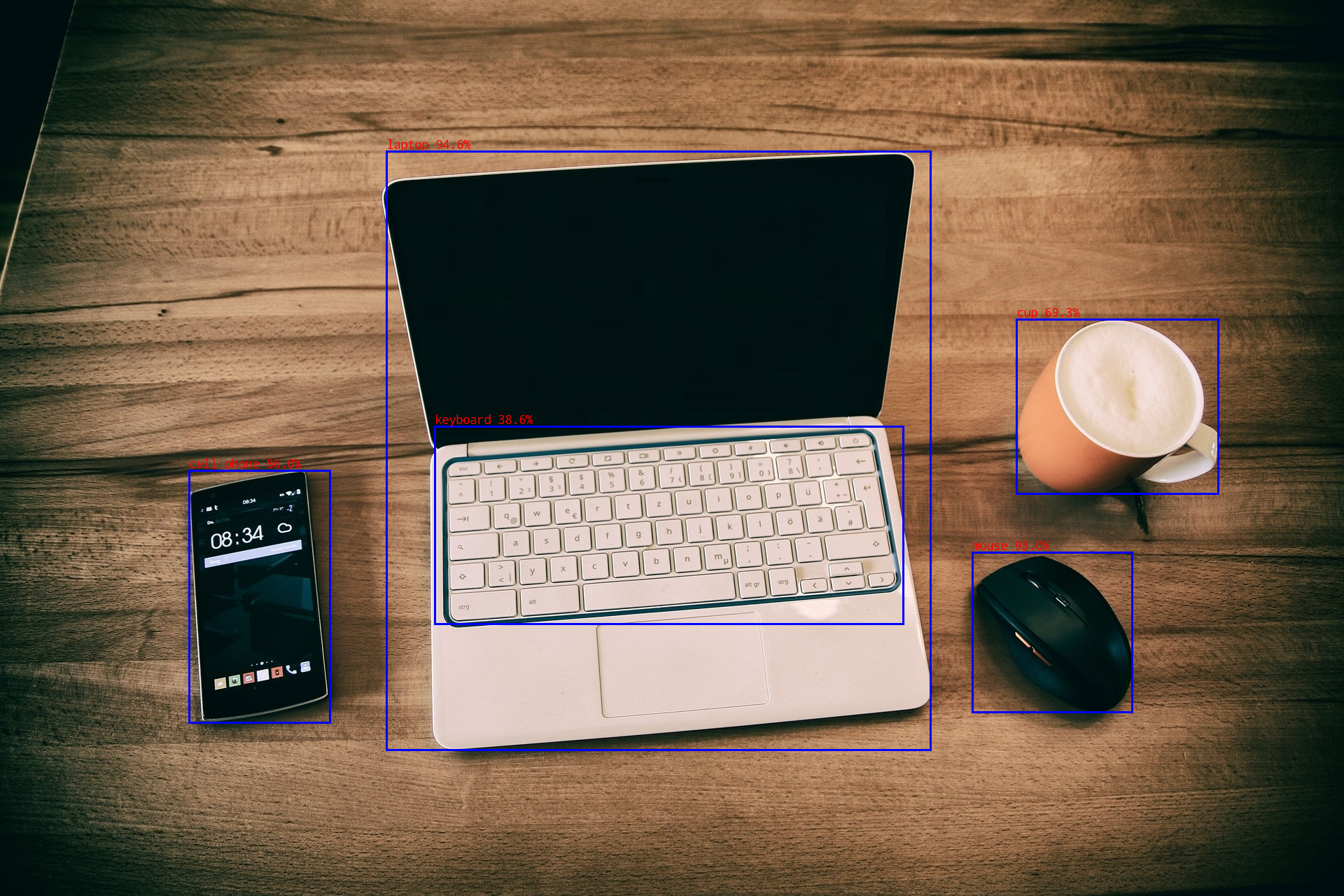 rknn_yolov10_demo/model/coco_80_labels_list.txt。例如,对象检测器能够定位图片中的办公用品。./rknn_yolov10_demo ./model/yolov10.rknn ./model/laptop.jpg- 推理结果: