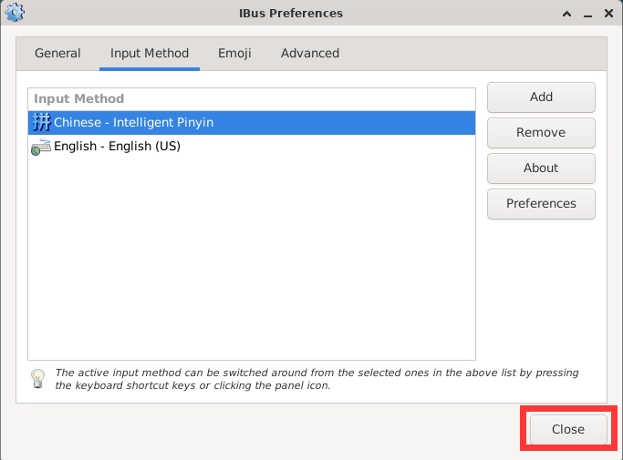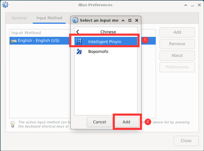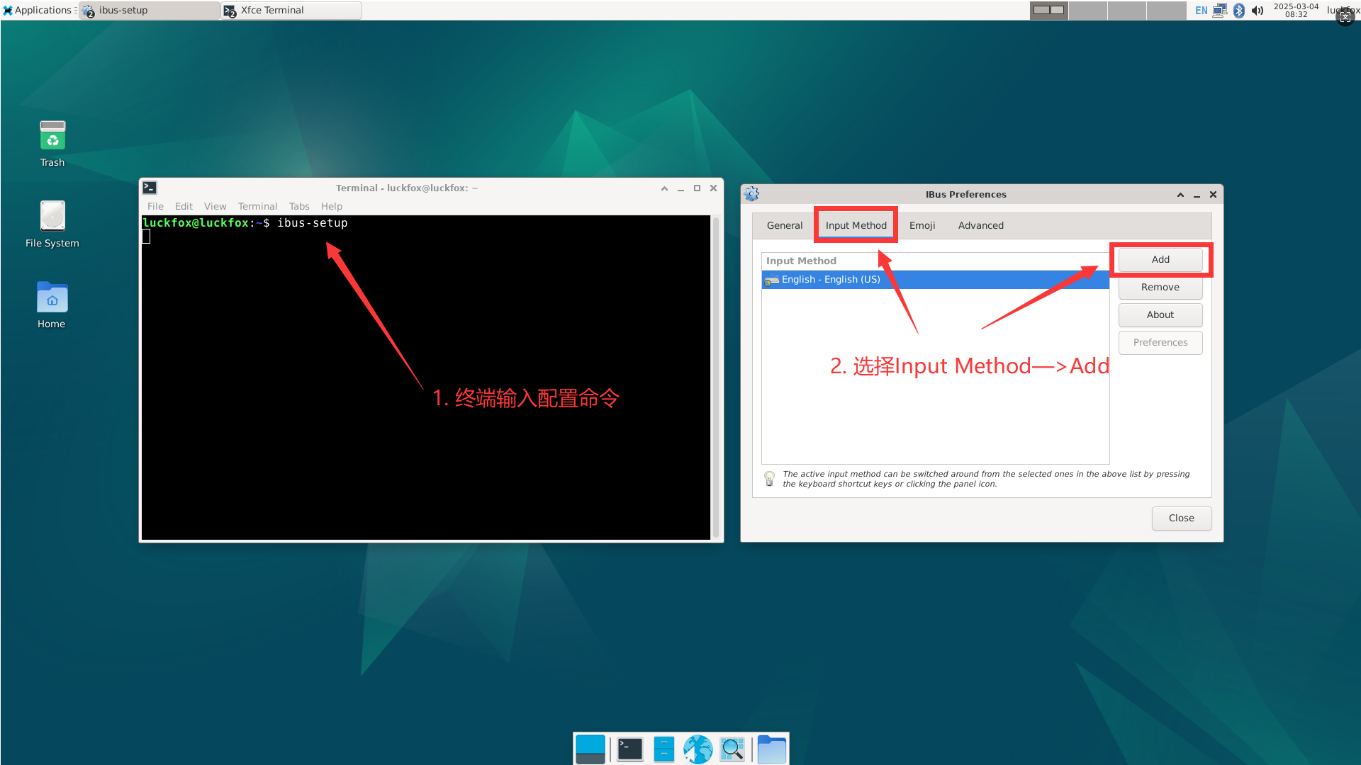 sudo apt install xfce4-terminal安装 IBUS 输入法及相关组件。